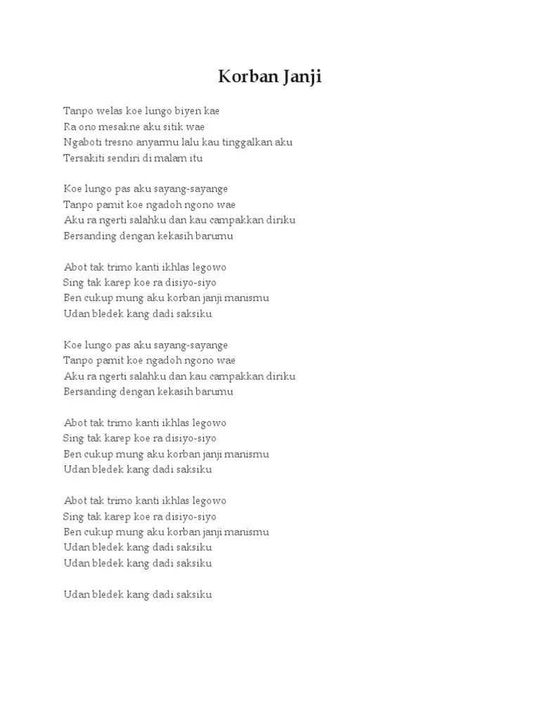 Mengingat bahwa lagu yang baik mengandung makna di dalamnya. Lirik lagu korban janji dan artinya. Tanpo welas kowe lungo mbiyen kae. Lagu korban janji dinyanyikan oleh artis terkenal indonesia jihan audy. Berikut ini terjemahan lirik lagu "korban janji" dan artinya dalam bahasa indonesia.